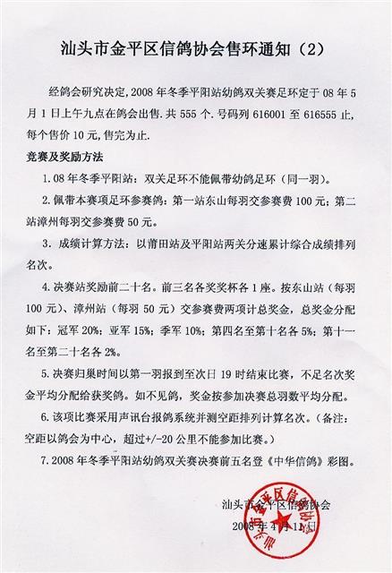 汕头市金平区信鸽协会08年冬季双关售环通知(2)