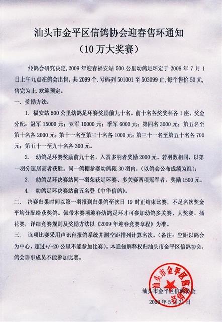 汕头市金平区信鸽协会09年迎春售环通知