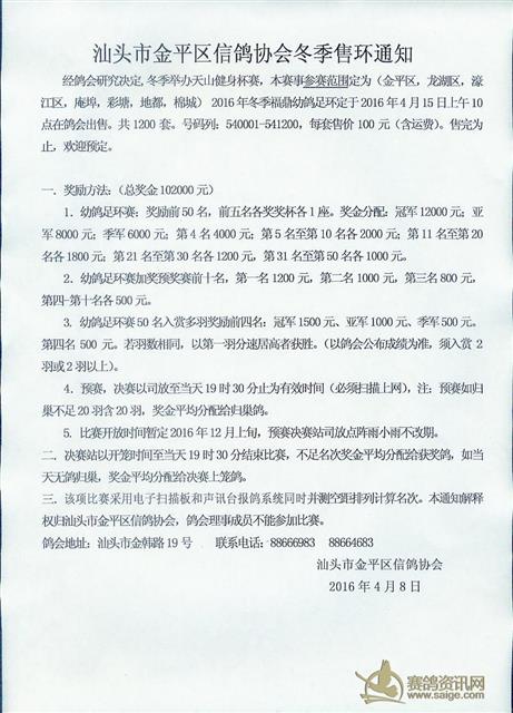 汕头市金平区信鸽协会 2016年冬季售环通知