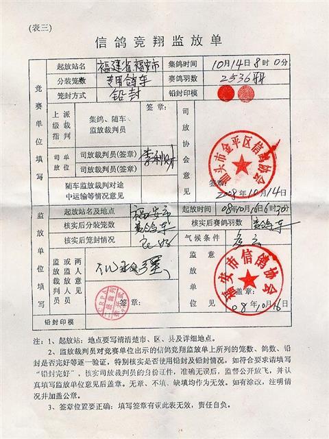 汕头市金平区信鸽协会08年秋季福安站监放表