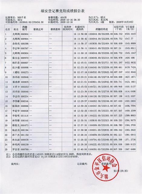 汕头市金平区信鸽协会08年秋季福安站登记赛成绩表