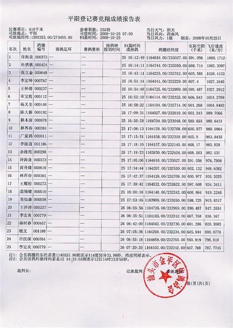 (新)汕头市金平区信鸽协会08年秋季平阳站登记赛成绩表