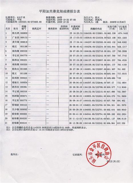汕头市金平区信鸽协会08年秋季平阳站加关赛成绩表