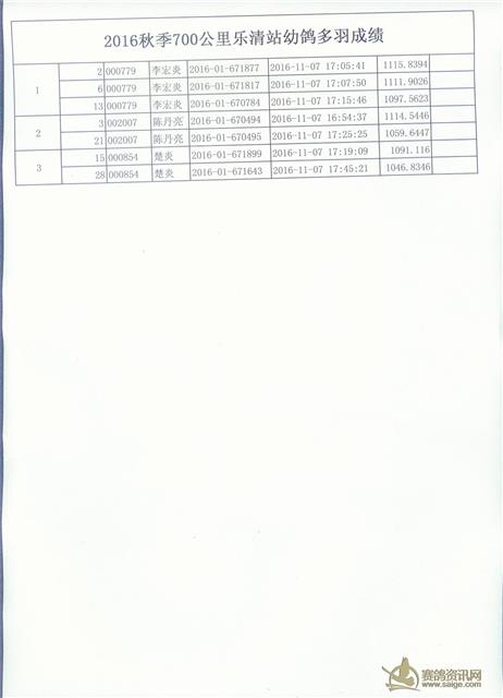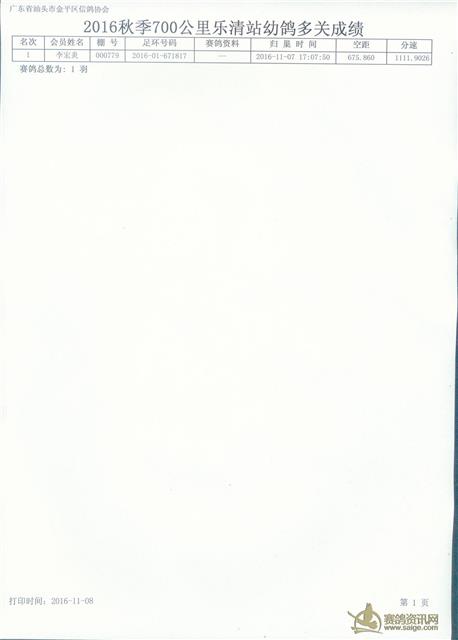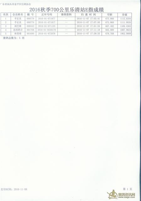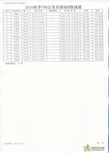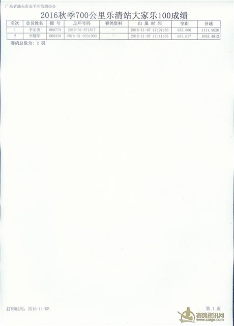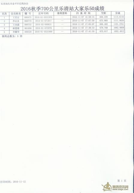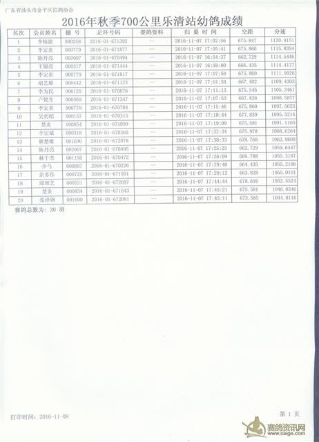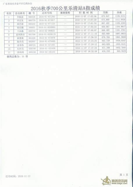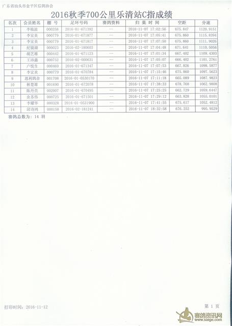 2016年汕头市金平区信鸽协会秋季700公里成绩