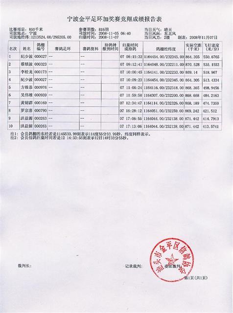 汕头市金平区信鸽协会2008年秋季宁波站金平足环加奖成绩