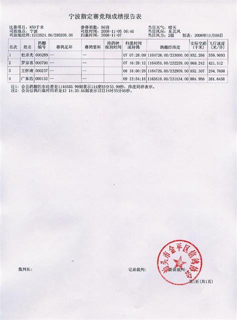 汕头市金平区信鸽协会2008年秋季宁波站指定赛成绩