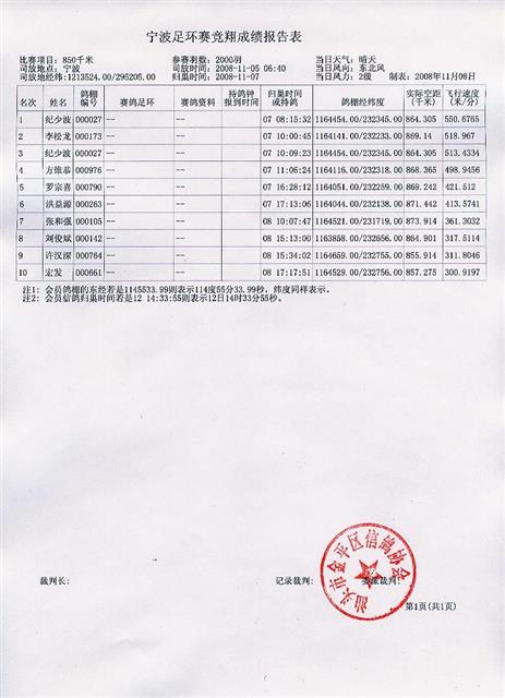 汕头市金平区信鸽协会2008年秋季宁波站足环赛成绩