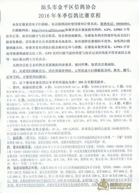 汕头市金平区信鸽协会2016年冬季比赛章程