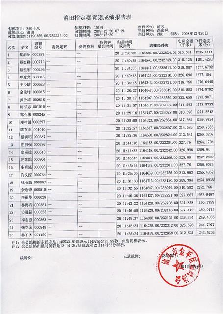 汕头市金平区信鸽协会2008年冬季莆田站指定赛成绩