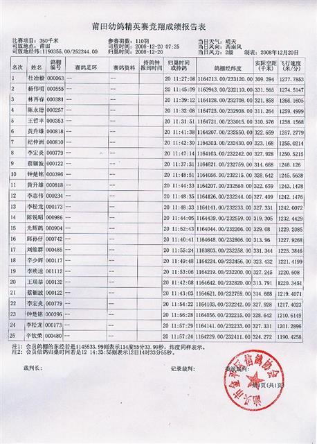 汕头市金平区信鸽协会2008年冬季莆田站幼鸽精英赛成绩