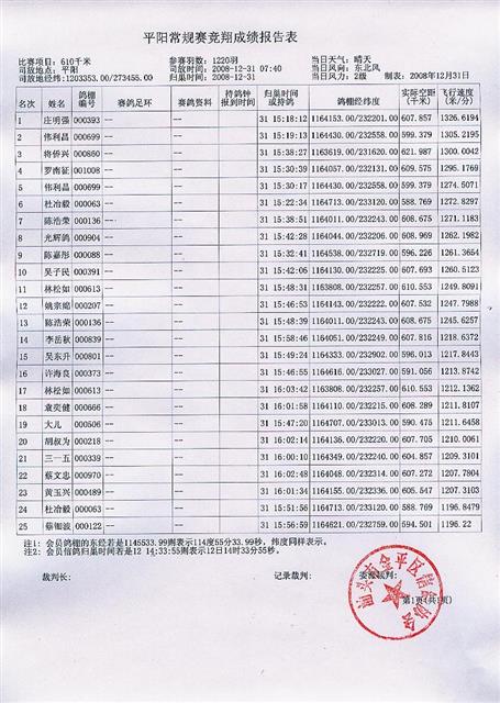 汕头市金平区信鸽协会2008年冬季平阳站常规赛成绩