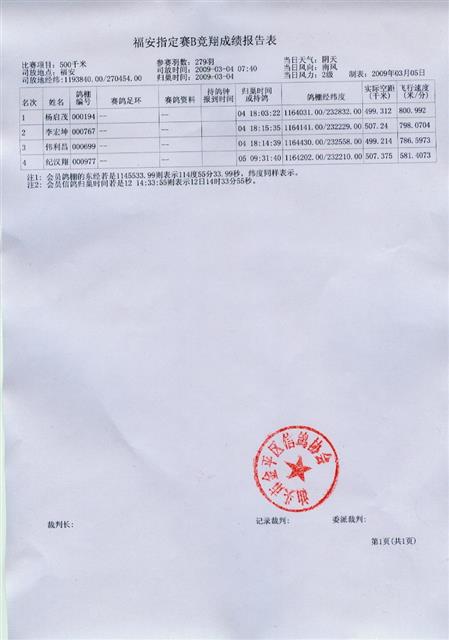 汕头市金平区信鸽协会09年迎春福安指定B成绩表