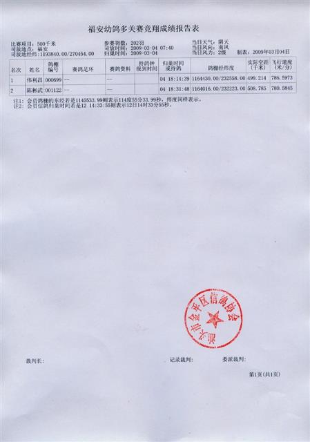 汕头市金平区信鸽协会09年迎春福安幼鸽多关成绩表