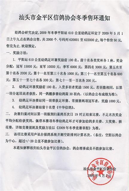 汕头市金平信鸽协会09年冬季售环通知