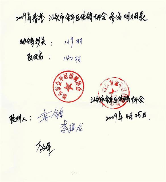 汕头市金平区信鸽协会09年春季汫州站明细表