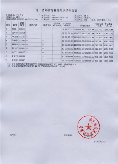 汕头市金平区信鸽协会09年春季莆田插花成绩表