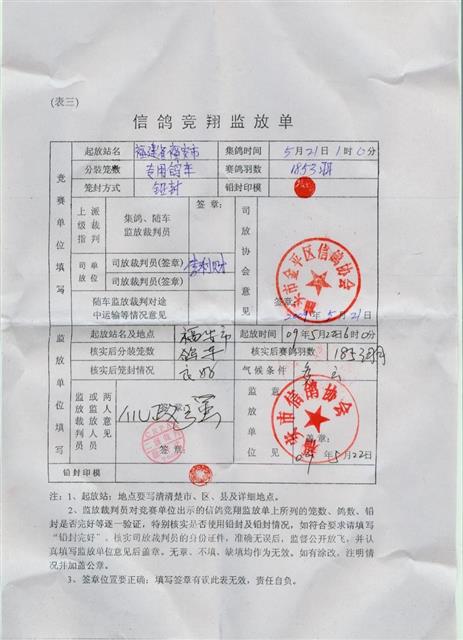 汕头市金平区信鸽协会09年春季福安站监放表