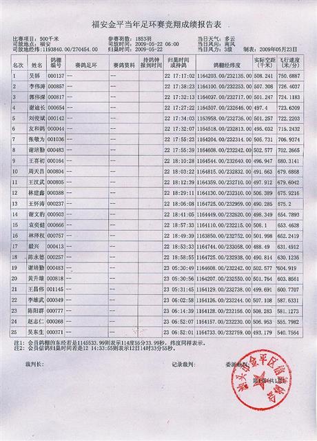汕头市金平区信鸽协会09年春季福安金平当年足环赛成绩