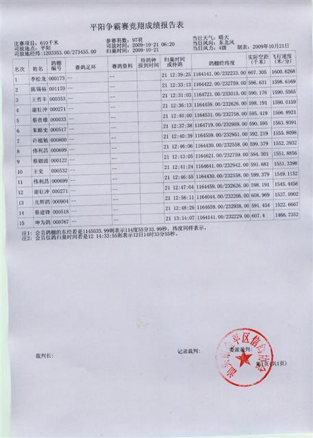 汕头市金平区信鸽协会09年秋季平阳站幼鸽争霸赛成绩