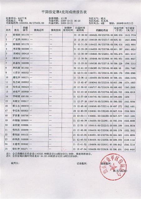 汕头市金平区信鸽协会09年秋季平阳站幼鸽指定赛A成绩