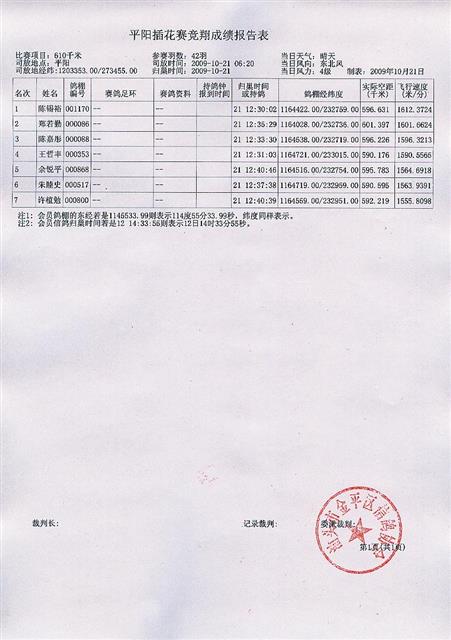 汕头市金平区信鸽协会09年秋季平阳站幼鸽插花赛成绩