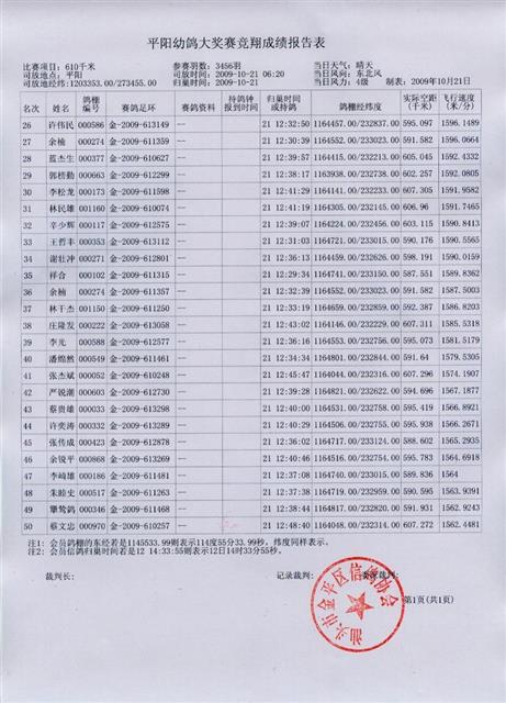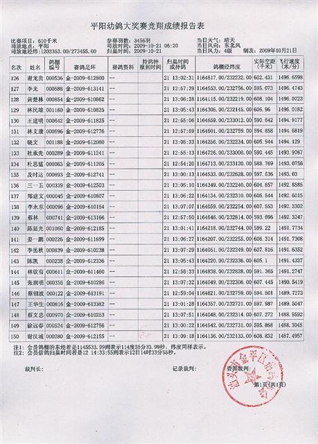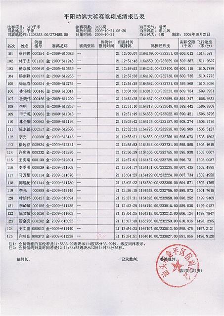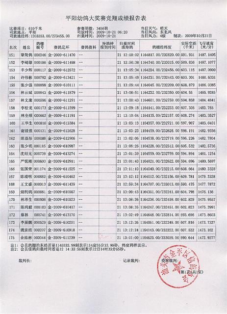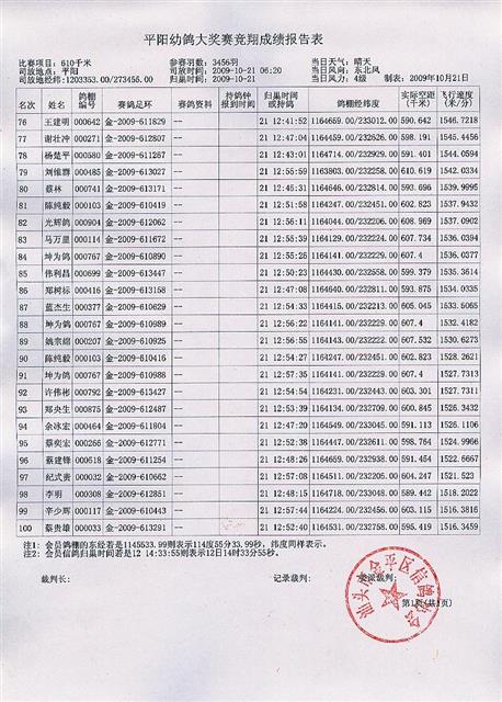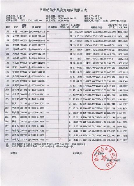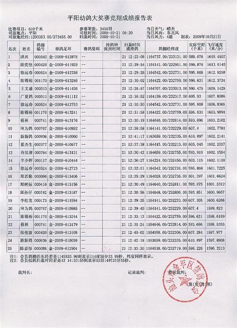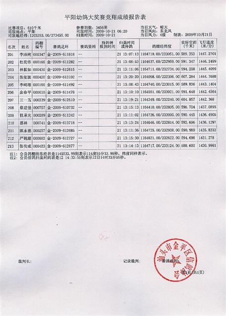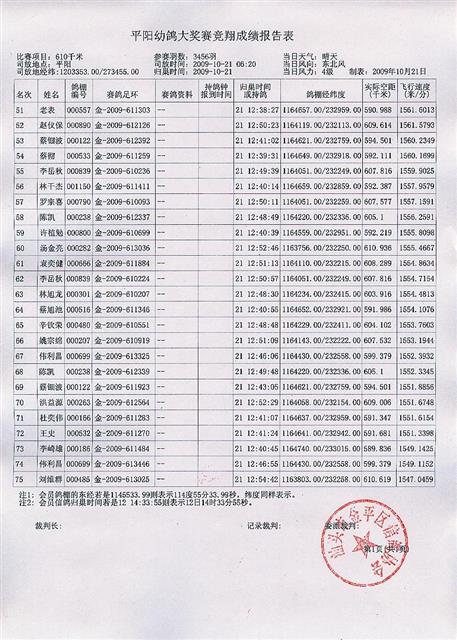 汕头市金平区信鸽协会09年秋季平阳站幼鸽大奖赛成绩