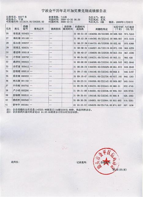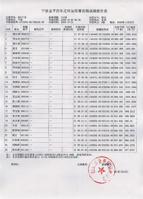 汕头市金平区信鸽协会09年秋季宁波站金平历年足环加奖成绩表