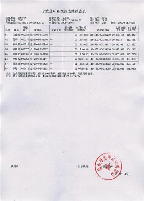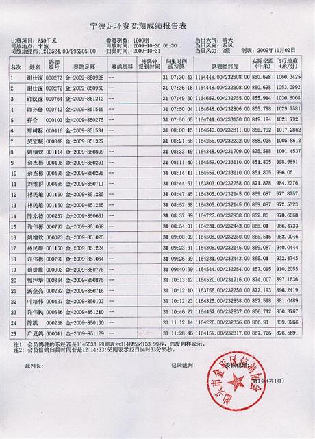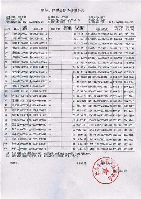 汕头市金平区信鸽协会09年秋季宁波站幼鸽足环赛成绩表