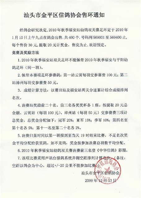 汕头市金平区信鸽协会2010年秋季500公里福安站双关赛售环通知