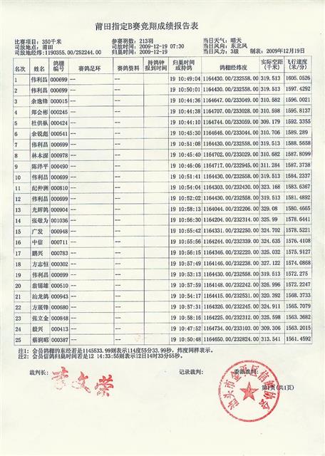 汕头市金平区信鸽协会09年冬季莆田站B指成绩表