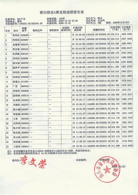 汕头市金平区信鸽协会09年冬季莆田站A指成绩表