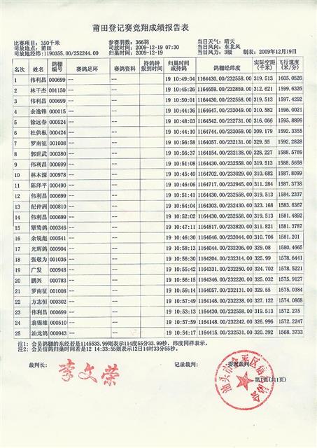 汕头市金平区信鸽协会09年冬季莆田站登记成绩表