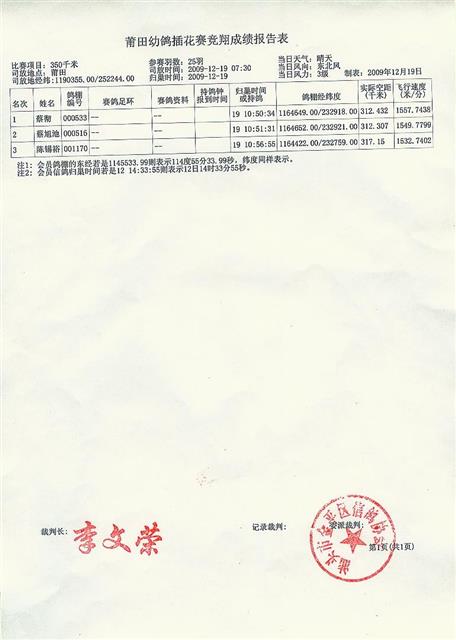 汕头市金平区信鸽协会09年冬季莆田站插花成绩表