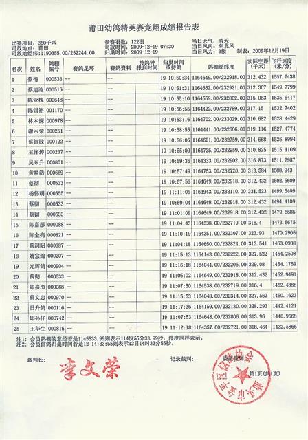 汕头市金平区信鸽协会09年冬季莆田站精英赛成绩表