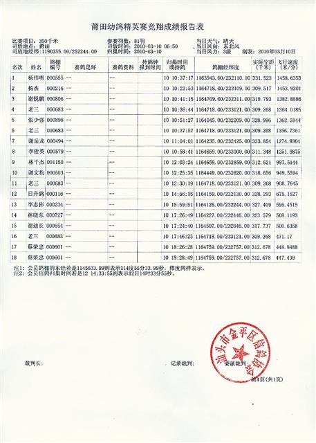 汕头金平区信鸽协会迎春莆田站精英赛成绩