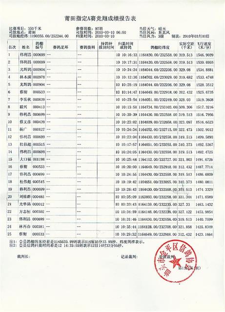 汕头金平区信鸽协会迎春莆田站A指成绩