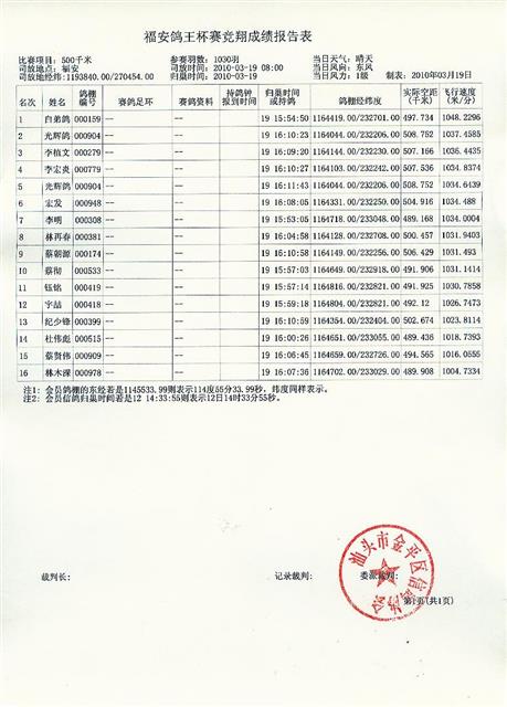 汕头市金平区信鸽协会迎春福安站鸽王杯赛成绩