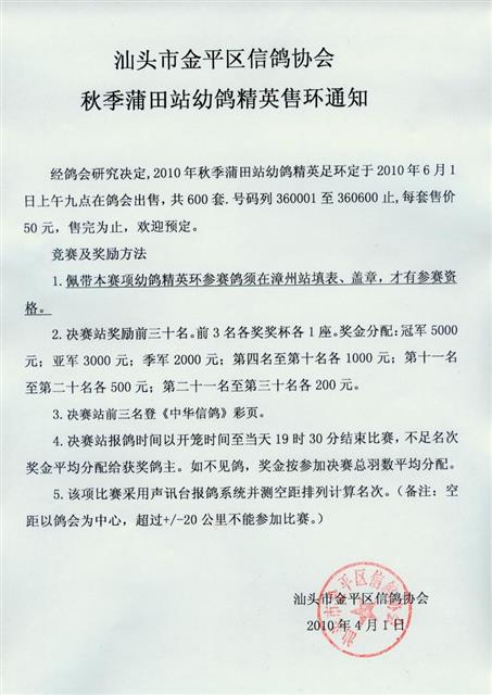 汕头市金平区信鸽协会2010年秋季莆田售环通知