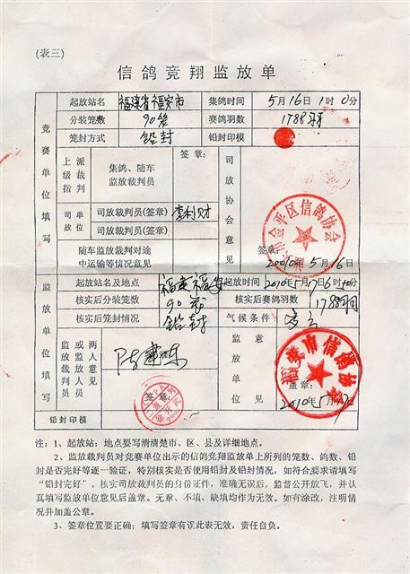 汕头市金平区信鸽协会2010年春季福安站开笼监放表