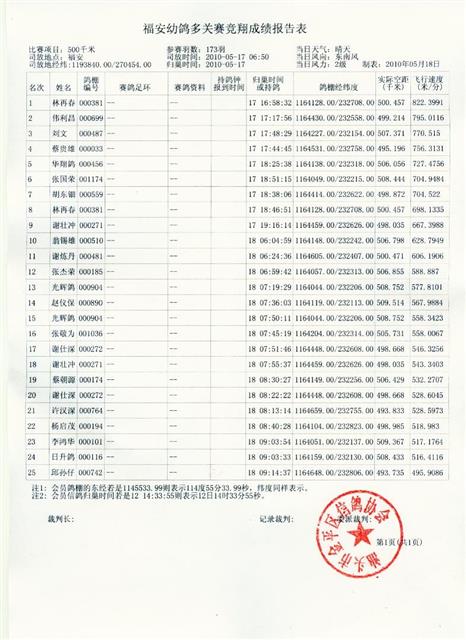 汕头市金平区信鸽协会2010年春季500足环多关赛成绩