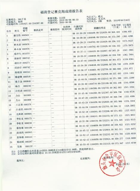 汕头市金平区信鸽协会2010年夏季福清站登记赛成绩