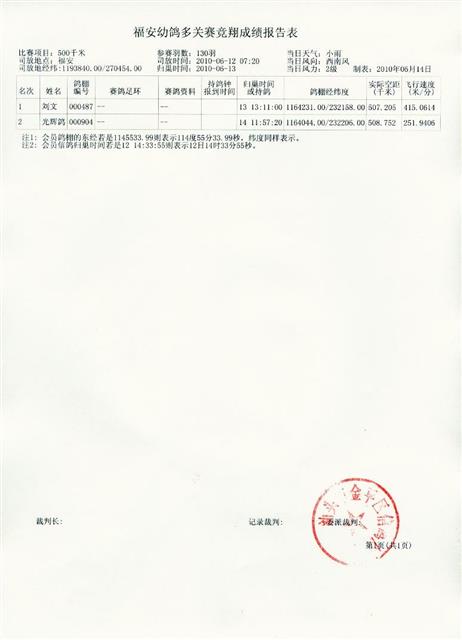 汕头市金平区信鸽协会2010年夏季福安站幼鸽多关赛成绩