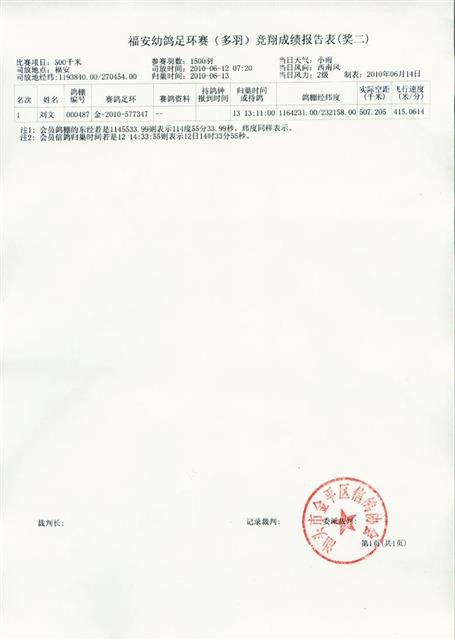 汕头市金平区信鸽协会2010年夏季福安站足环多羽赛成绩