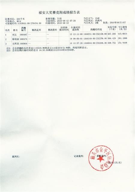 汕头市金平区信鸽协会2010年夏季福安站幼鸽大奖赛成绩