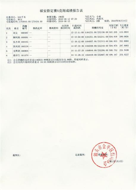 汕头市金平区信鸽协会2010年夏季福安站A指定赛成绩