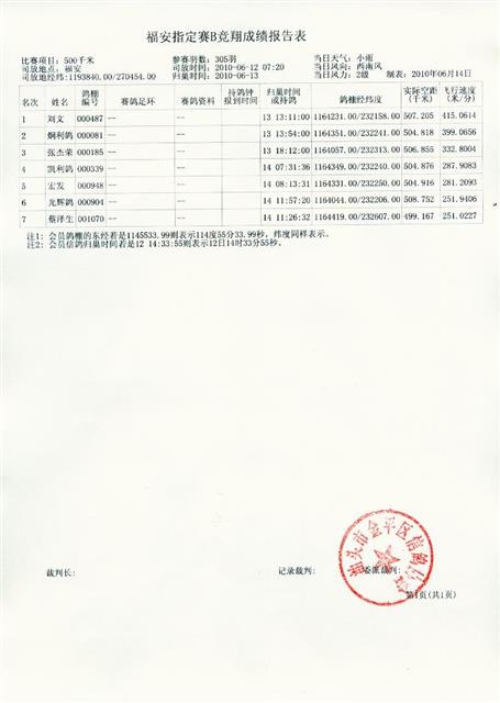 汕头市金平区信鸽协会2010年夏季福安站B指定赛成绩