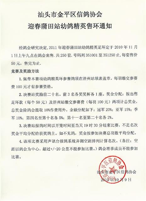 汕头市金平信鸽协会2011年迎春350公里售环通知
