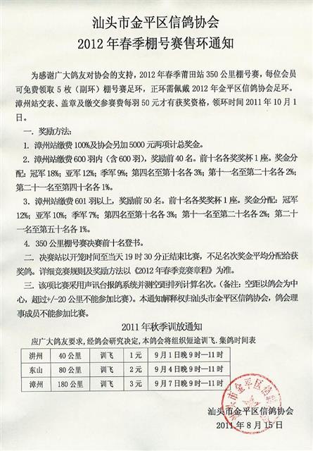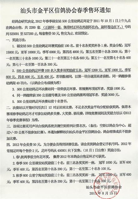 汕头市金平区信鸽协会2012年春季售环通知