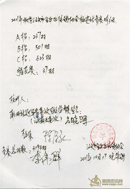 汕头市金平区信鸽协会2011年秋季福安站明细表