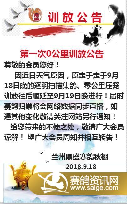 兰州鼎盛赛鸽公棚(秋)棚第一次零公里训放公告 尊敬的会员您好! 由于天气️原因,原定于9.18进行的逐羽扫描集鸽,顺延至9.19晚进行,次日零公里压笼训放!届时请关注网站同步数据直播,为给您带来的不便敬请谅解!如遇其他变化,请关注网站另行通知! 兰州鼎盛赛鸽公棚感谢广大会员的大力支持和厚爱!同时预祝广大会员2018秋季赛事摘金夺银,赛出佳绩,收获辉煌!